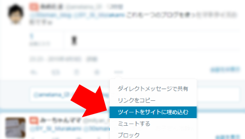 パソコンの場合は、まず、埋め込みたいツイートのメニューの「その他」にある「ツイートをサイトに埋め込む」をクリックします。