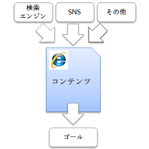 この段階で着目すべきは、訪問者がコンテンツ①からコンテンツ②へと離脱すること無くスムーズに進んで貰えるかどうか(青い矢印の部分)ですね。