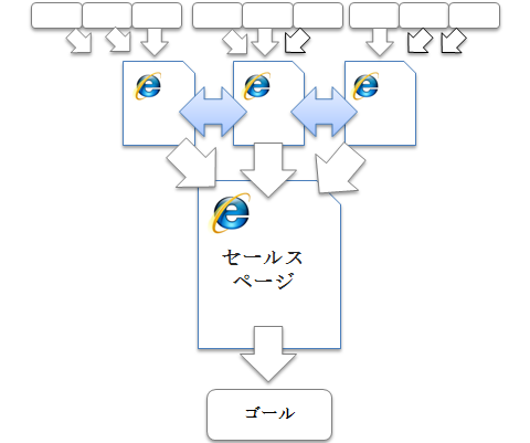 この段階が上手く構築できるようになると、コンテンツを多段階の階層構造で構築したり、次の絵のように複数コンテンツからセールスページへと集客したりという事が可能になります。