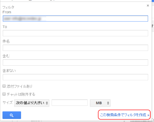 3. ここでフィルターの設定を行いますが、アドレスの他に、宛先、件名やサイズ等など様々な条件が指定できます。