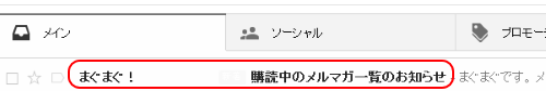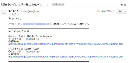 3. すると入力したGmailのアドレス宛てに「購読中のメルマガ一覧のお知らせ」というメールが送られてきます。