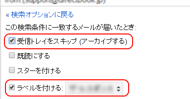 4. 次に振り分けの設定ですが、「受信トレイをスキップする」と「ラベルを付ける」にチェックを入れ、任意のラベルを指定します。
