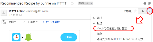 2.  メール右上の「ドロップダウン」ボタンをクリックし、表示されたメニューから「メールの自動振り分け」を選びます。