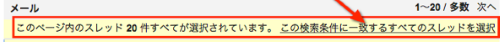 3. 結果に20件以上ある場合は、「この検索条件に一致するすべてのスレッドを選択」という表示が出るので、そこをクリックし、ゴミ箱を選択。